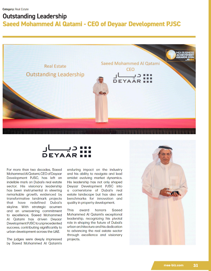 In October 2017, Deyaar Facilities Management has won the Construction Innovation Awards under the Category of FM Company Of The Year. The award recognizes individual excellence, corporate strengths, and project success. The award for the Facilities Management (FM) Company of the Year was presented to the outstanding performer in the region's FM sector which was based on strong evidence of growth, expansion during the period, delivery of quality service, innovation, and use of new technology.